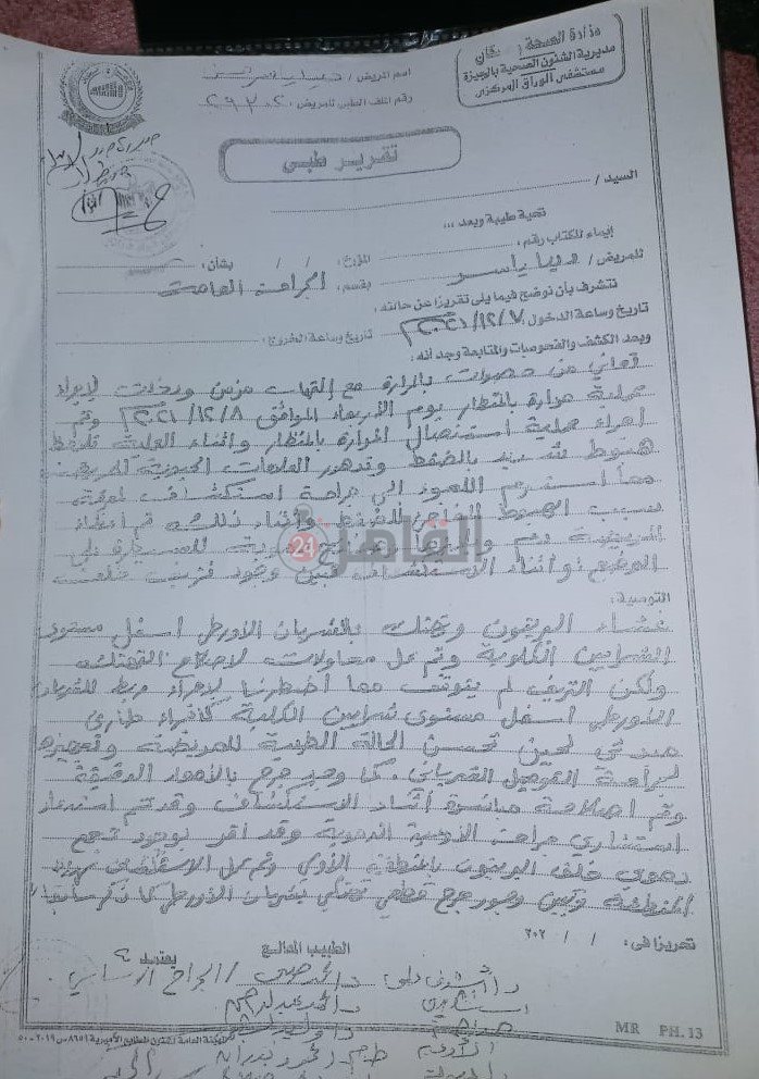 وحصل القاهرة 24 على التقرير الطبى الخاص بحالة المجنى عليها دينا البالغة من العمر 23 عام، وقال التقرير الطبي أن بعد الكشف والندوات والمتابعة وجد أنه العامة حرارة بالقطار يوم الأربعاء الموافق 8/12/2021 تعاني من حصوات بالمرارة من التهاب مزمن ودخلت لإجراء عملية استئصال المرارة بالمنظار واثناء العملية لاحظ هبوط شديد بالضغط وتدهور العلامات الحيوية للمريضة مع استلزام جراحة استكشاف لمعرفة سبب الهبوط المفأجي