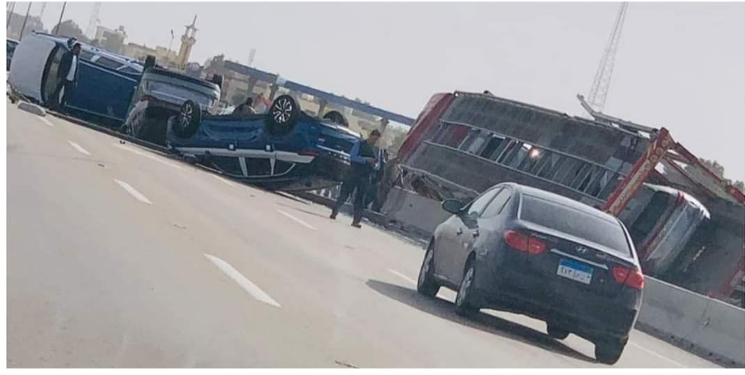 وأظهرت صورة تداولها نشطاء على موقع التواصل الاجتماعي "فيس بوك" الصور انقلاب المقطورة في وسط الطريق، الأمر الذي أدى إلى تعطيل حركة المرور على الطريق.