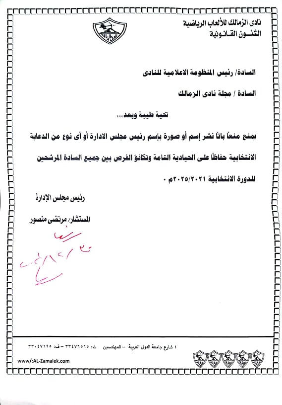 قرر المستشار مرتضى منصور، رئيس نادي الزمالك، منع نشر اسمه أو صورته أو أي نوع من أنواع الدعاية الانتخابية.