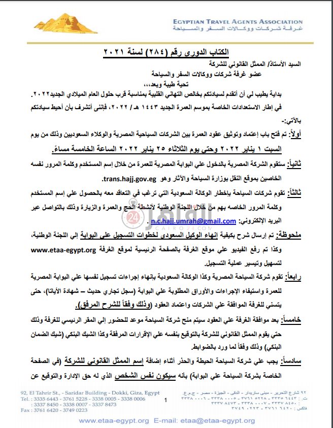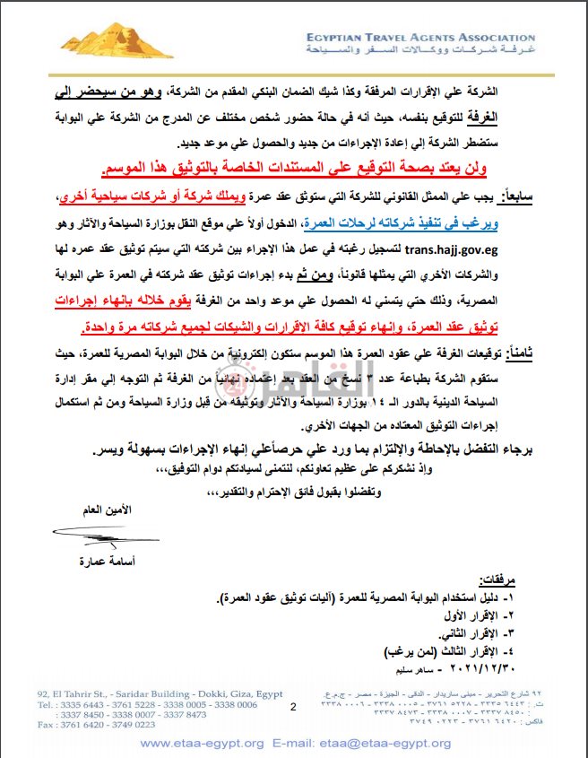 وأضاف الأمين العام لغرفة شركات السياحة ووكالات السفر في خطابه، أنه سيتم فتح باب اعتماد وتوثيق عقود العمرة بين الشركات السياحية المصرية والوكلاء السعوديين بدءا من غدا السبت 1 يناير 2022 وحتى يوم الثلاثاء 30 يناير 2022 الساعة الخامسة مساء ثانيا، مشيرًا إلى أن الشركة المصرية ستقوم بالدخول على البوابة المصرية للعمرة من خلال اسم المستخدم وكلمة المرور نفسه الخاصين بموقع النقل بوزارة السياحة والآثار، وهو trans.hajj.gov.eg.