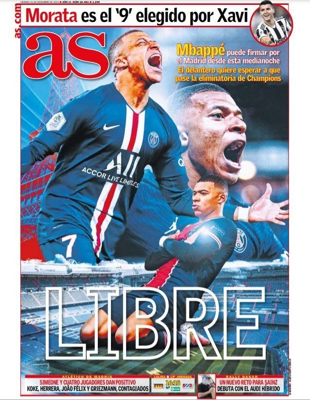 تصدر العنوان مجانًا.. يمكن لمبابي التوقيع مع ريال مدريد من منتصف الليل، عنوان الصحيفة، موضحة أن مبابي قرر الانتظار حتى تنتهي مباراة دوري أبطال أوروبا.