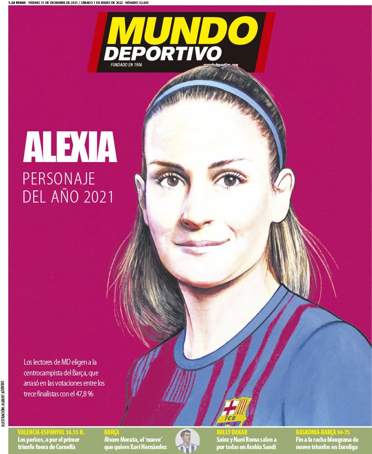 تصدرت أليكسيا بوتياس لاعبة فريق برشلونة للسيدات، والحاصلة على جائزة البالون دور 2021 غلاف موندو ديبورتيفو في العدد الأخير لها للعام الجاري، حيث عنونت الصحيفة بـ أليكسيا شخصية عام 2021.