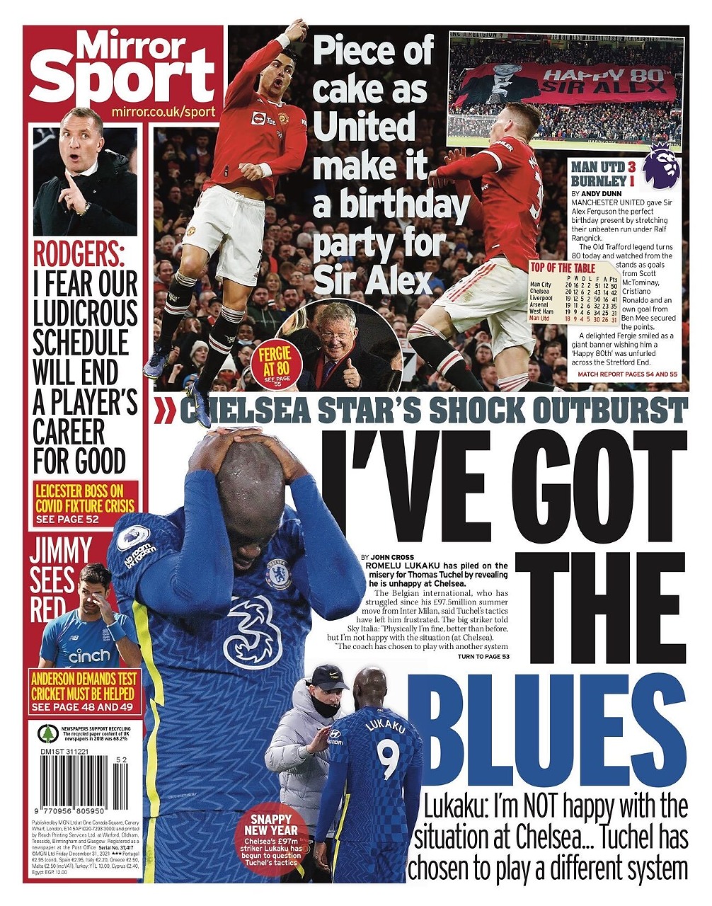 تصدر روميلو لوكاكو غلاف صحيفة ميرور الإنجليزية لعدد اليوم، وذلك بعد أن عنونت بـ نجم تشيلسي يصدم الجميع.. ويؤكد عدم سعادته في تشيلسي، عقب كشف اللاعب في مقابلة مع سكاي سبورتس، رغبته في العودة إلى أنتر ميلان، كما سلطت الصحيفة الضوء على فوز مانشستر يونايتد أمام بيرنلي، وأنه بمثابة هدية عيد ميلاد السير أليكس فيرجسون.
