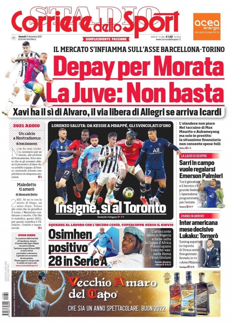 تصدر الثنائي ممفيس ديباي وألفارو موراتا غلاف كوريري ديللو سبورت لعدد اليوم، حيث أوضحت الصحيفة أن هناك صفقة تبادلية قد تتم في الأيام المقبلة بين برشلونة ويوفنتوس تتضمن الطرفين، بعد اهتمام الكتالوني بالتعاقد مع موراتا.