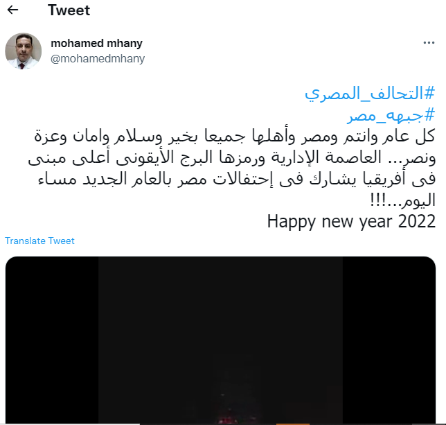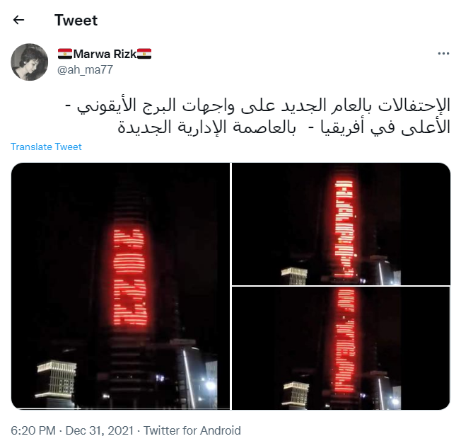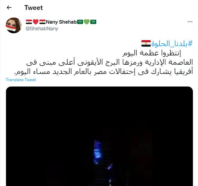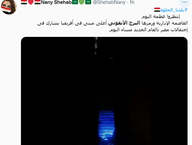 وكتب حساب باسم ناني هشام: بلدنا_الحلوة، انتظروا عظمة اليوم، العاصمة الإدارية ورمزها البرج الأيقونى أعلى مبنى في إفريقيا يشارك في احتفالات مصر بالعام الجديد مساء اليوم.