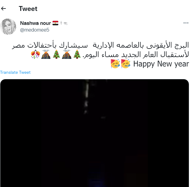 بينما قالت نشوى نور: البرج الأيقونى بالعاصمة الإدارية سيشارك باحتفالات مصر لاستقبال العام الجديد مساء اليوم، Happy new year.