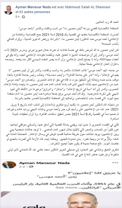 حيث نشر الدكتور أيمن منصور ندا رئيس قسم الإذاعة والتلفزيون بكلية الإعلام جامعة القاهرة، عبر صفحته على مواقع التواصل الإجتماعي، بأن المحكمة الاقتصادية برأته من اتهامه بسب الإعلامي أحمد موسى.