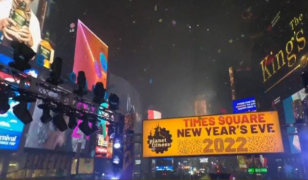 اجتمع الآلاف في ميدان تايمز سكوير في نيويرك، حيث قرر عمدة المدينة الاحتفالا مع الالتزام بقيود الإجراءات الاحترازية وارتداء الكمامة وتقليل عدد الحضور، وكانت أشكال الكمامة مميزة وعلى طراز حديث ملونة بالبنفسجي والأصفر ومكتوب عليها عام 2022 مع قبعات مميزة من نفس الشكل، وبدأت الساعة في منتصف الميدان قبل منتصف الليل بالعد التنازلي للعام الجديد بدقيقة، وانهالت الأحضان والقبلات والرقص عندما انتهى العد، بالإضافة إلى مشهد سقوط الكرة البلورية في نيويرك والتي تعتبر من الطقوس المعتادة في احتفال الامريكين في نيويرك الذي يستمر منذ أكثر من مائة عام.