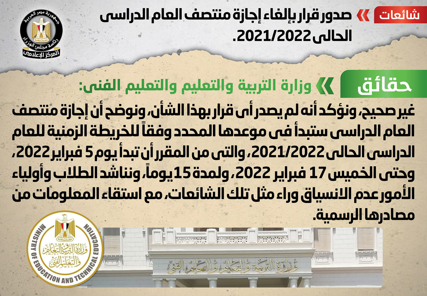 وتواصل المركز الإعلامي لمجلس الوزراء مع وزارة التربية والتعليم والتعليم الفني، والتي نفت تلك الأنباء، مُؤكدةً أنه لا صحة لصدور قرار بإلغاء إجازة منتصف العام الدراسي الحالي 2021/2022، وأنه لم يصدر أي قرار بهذا الشأن، مُوضحةً أن إجازة منتصف العام الدراسي ستبدأ في موعدها المحدد وفقًا للخريطة الزمنية للعام الدراسي الحالي 2021/2022، والتي من المقرر أن تبدأ يوم 5 فبراير 2022، وحتى الخميس 17 فبراير 2022، ولمدة 15 يوما، مُناشدةً الطلاب وأولياء الأمور عدم الانسياق وراء مثل تلك الشائعات، مع استقاء المعلومات من مصادرها الرسمية.