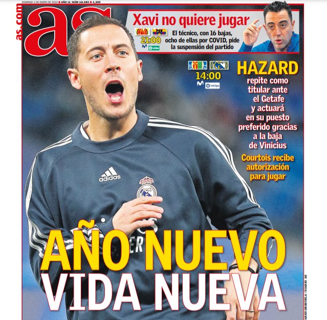 تصدر إيدين هازارد، لاعب فريق ريال مدريد - غلاف آس، حيث عنونت الصحيفة بـ عام جديد، حياة جديدة، موضحة أن هازارد اليوم، سوف يلعب مرة أخرى في مركزة المُفضل، بسبب غياب فينيسيوس المُصاب بالفايروس.