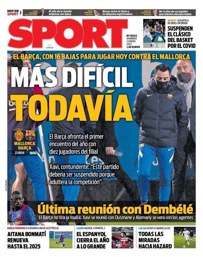 عنونت سبورت غلافها بـ أكثر صعوبة حتى الآن، حيث قالت الصحيفة، إن برشلونة يُواجه المباراة الأولى في العام بعشرة لاعبين من الفريق الأول.