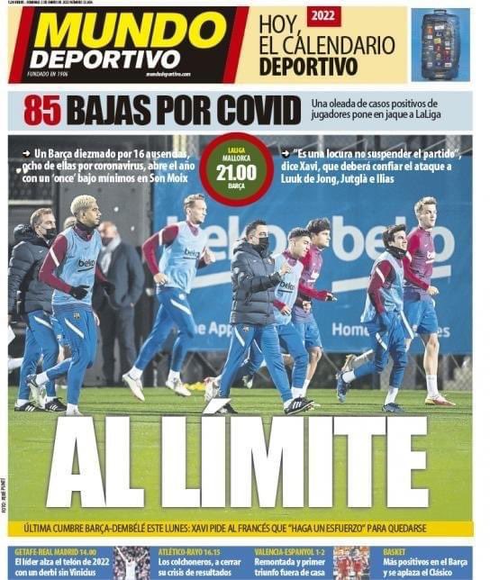 تصدر العنوان - إلى الحد الأقصى- غلاف موندو ديبورتيفو لعدد اليوم، حيث قالت الصحيفة إنه من الجنون؛ عدم تأجيل المباراة، كما يقول تشافي الذي يتعين عليه أن يعهد بالهجوم إلى لوك دي يونج، جوتاجلا إلياس.