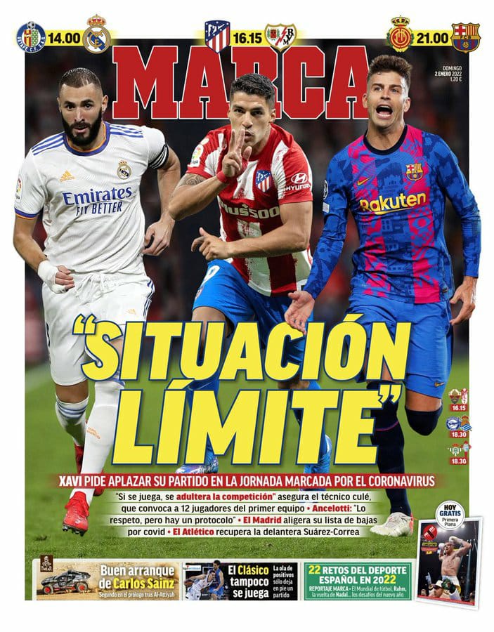عنونت ماركا في غلافها اليوم بـ الوضع المحدد، حيث سلطت الضوء على تضارب تصريحات تشافي وأنشيلوتي، بشأن تأجيل المباريات، بسبب تفشي حالات فيروس كورونا.