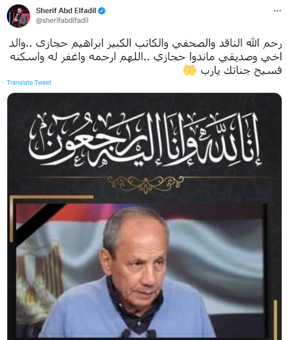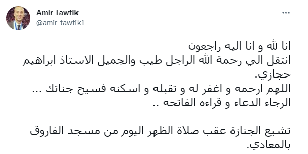 وغرد أمير توفيق، مدير التعاقدات في النادي الأهلي عبر حسابه: إنا لله وإنا إليه راجعون.. انتقل إلى رحمة الله الراجل الطيب والجميل إبراهيم حجازي.. اللهم ارحمه واغفر له وتقبله وأسكنه فسيح جناتك.. الرجاء الدعاء وقراءة الفاتحة.