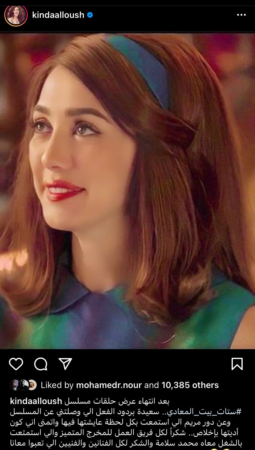 ونشرت كندة علوش، صورة لها عبر حسابها الشخصي بموقع تبادل الصور والفيديوهات القصيرة انستجرام، وقالت: بعد انتهاء عرض حلقات مسلسل ستات بيت المعادي..سعيدة بردود الفعل التي وصلتني عن المسلسل وعن دور مريم التي استمتعت بكل لحظة عايشتها فيها وأتمنى أن أكون أديتها بإخلاص.