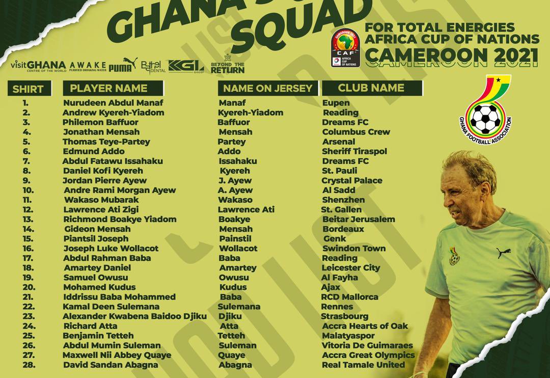 أعلن الصربي، ميلوفان راجيفاتش، المدير الفني لمنتخب غانا القائمة النهائية للفريق استعدادا لخوض منافسات كأس أمم إفريقيا 2021، والتي من المقرر أن تنطلق يوم 9 يناير الجاري.