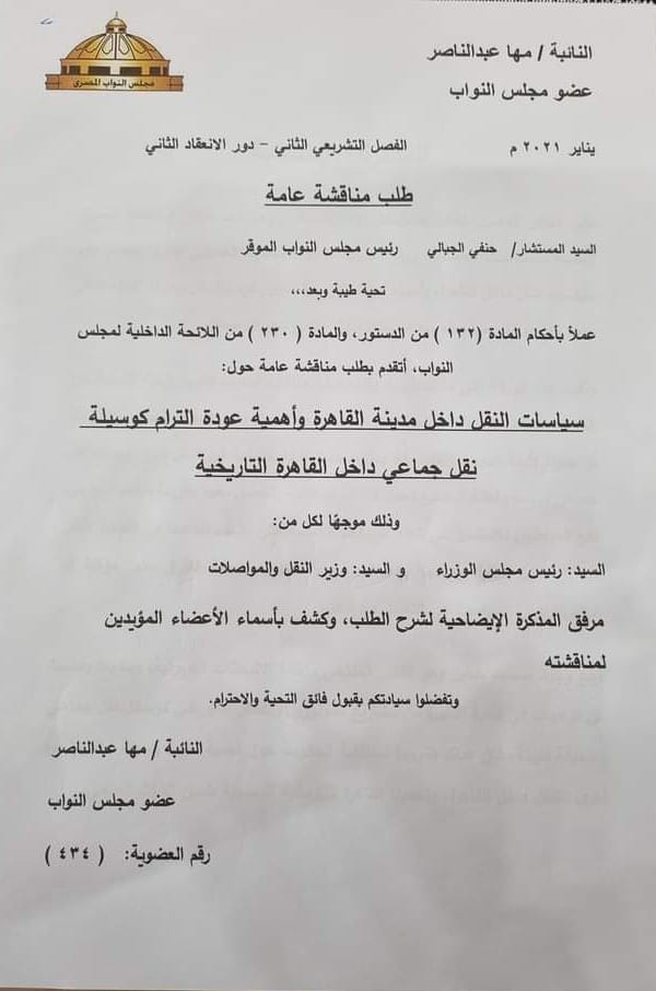 تقدمت النائبة مها عبد الناصر، عضو مجلس النواب، وعضو الحزب المصري الديمقراطي الاجتماعي، بطلب مناقشة عامة موجه لكل من رئيس مجلس الوزراء، ووزير النقل والمواصلات، حول سياسات النقل داخل مدينة القاهرة، وأهمية عودة الترام - كوسيلة نقل جماعي داخل القاهرة التاريخية، وذلك في إطار البحث عن حلول جذرية صديقة للبيئة لمشكلة المرور والنقل.