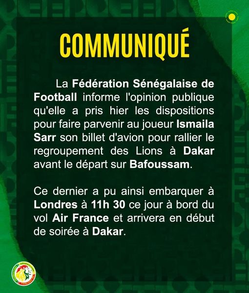 وقال الاتحاد السنغالي في بيان رسمي منذ قليل عبر حسابه على موقع التواصل الاجتماعي تويتر: تم التوصل إلى اتفاق مع مسؤولي نادي واتفورد الإنجليزي فيما يتعلق بضم إسماعيلا سار إلى بعثة منتخب السنغال المُشاركة في كأس أمم إفريقيا، وذلك بعد اتصالات مكثفة درات بين الأطراف المعنية في الساعات الأخيرة.