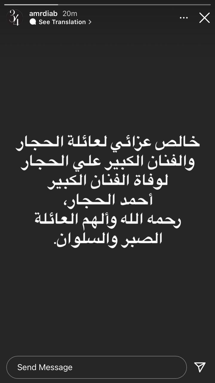 وكتب عمرو دياب عبر خاصية ستوري على حسابه الرسمي بموقع تبادل الصور والفيديوهات انستجرام: خالص عزائي لعائلة الحجار، والفنان الكبير علي الحجار، لوفاة الفنان الكبير أحمد الحجار، رحمه الله وأهلم العائلة الصبر والسلوان.