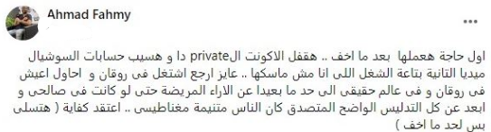 وكتب أحمد فهمي منشورًا، عبر حسابه الشخصي بموقع التواصل الاجتماعي فيسبوك، قال فيه: أول حاجة هعملها بعد ما أخف، هقفل الأكونت الـ Private دا، وهسيب حسابات السوشيال ميديا التانية بتاعة الشغل اللي أنا مش ماسكها.