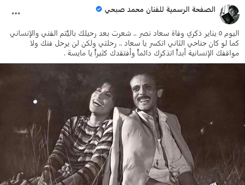 وكتب محمد صبحي منشورًا، عبر حسابه الشخصي بموقع التواصل الاجتماعي فيسبوك، قائلًا: اليوم 5 يناير ذكرى وفاة سعاد نصر؛ شعرت بعد رحيلك باليُتم الفني والإنساني، كما لو كان جناحي الثاني اتكسر يا سعاد، رحلت ولكن لن يرحل فنك ولا مواقفك الإنسانية أبدًا، أتذكرك دائمًا وأفتقدك كثيرًا يا مايسة.