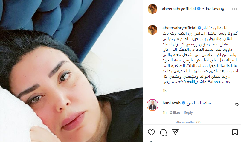 شاركت الفنانة عبير صبري جمهورها، بصورة جديدة لها من العزل الصحي، بعد إصابتها بفيروس كورونا الأيام الماضية، كاشفةً من خلالها آخر تطورات حالتها الصحية.