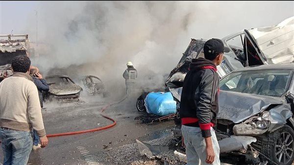 وشهد طريق الدائري الأوسطي بالقرب من 15 مايو، حادث مروع حيث اصطدم عدد من السيارات ما أسفر عن اشتعال النيران في 10 سيارات من بينهما «تريلا» محملة بالسيارات.