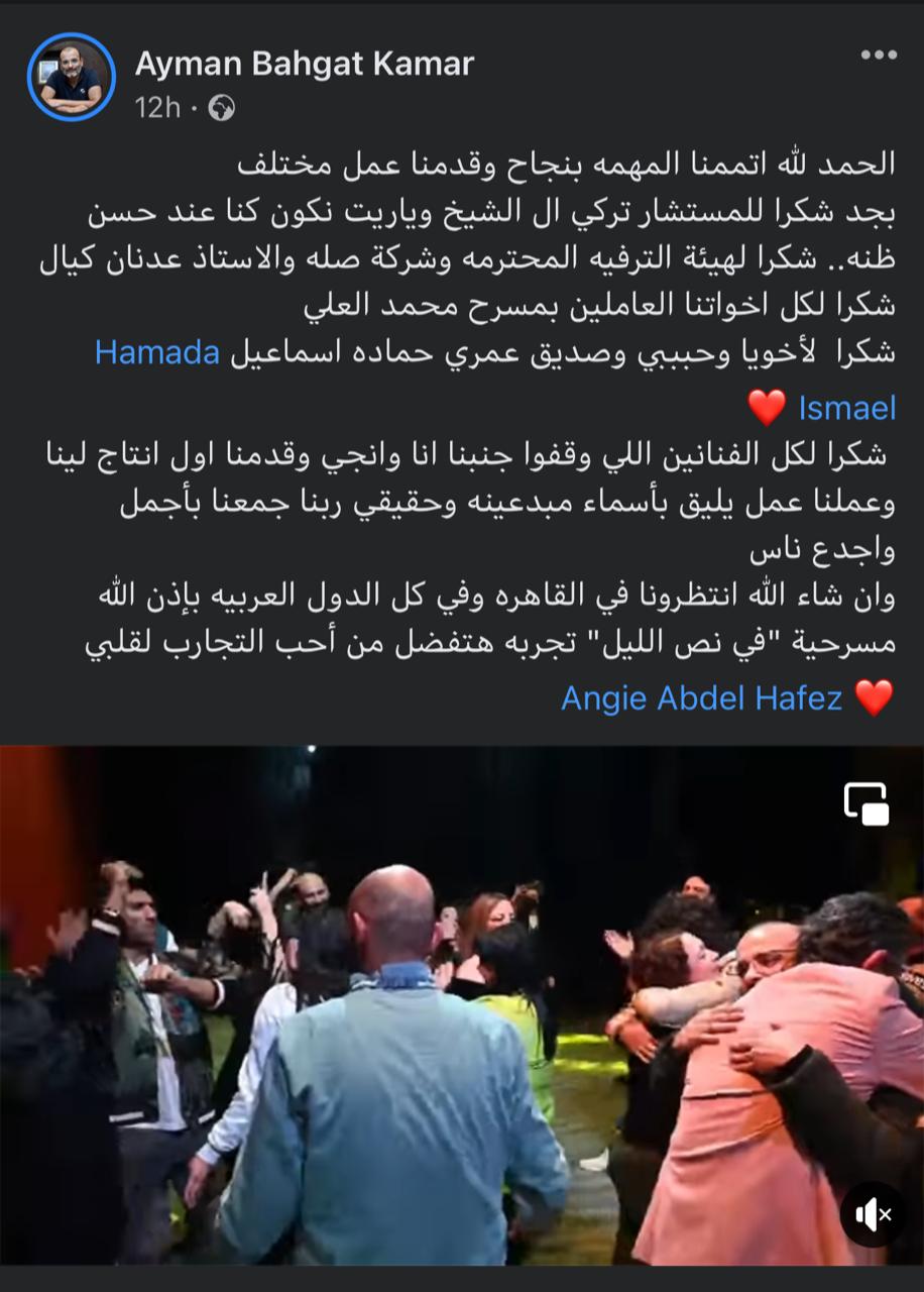 وتابع أيمن بهجت قمر، قائلًا: إن شاء الله انتظرونا في القاهرة، وفي كل الدول العربية بإذن الله مسرحية في نص الليل، تجربة هتفضل من أحب التجارب لقلبي..