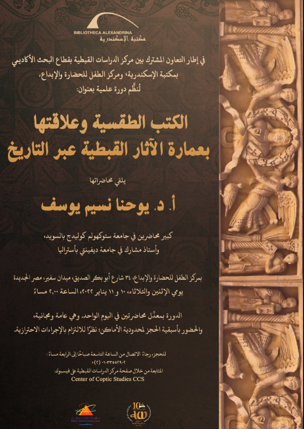 ينظم مركز الدراسات القبطية بمكتبة الإسكندرية، بالتعاون مع مركز الطفل للحضارة والإبداع، دورة علمية بعنوان الكتب الطقسية وعلاقتها بعمارة الآثار القبطية عبر التاريخ.