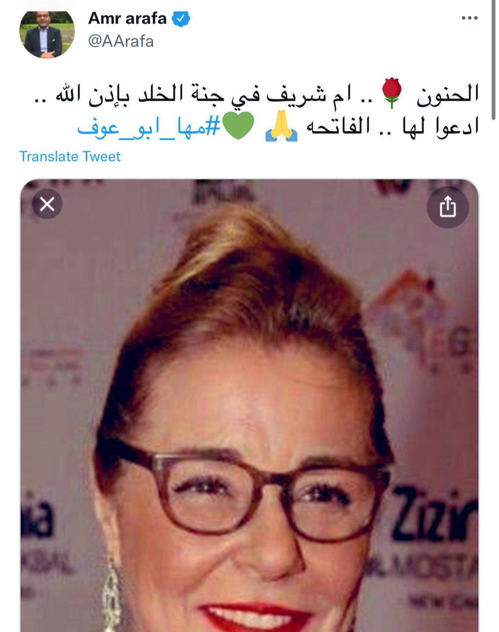 ونشر المخرج عمرو عرفة عبر حسابه على موقع التغريدات تويتر صورة للراحلة، وعلق عليها قائلا: الحنون أم شريف في جنة الخلد.. ادعوا لها.. مها أبو عوف.