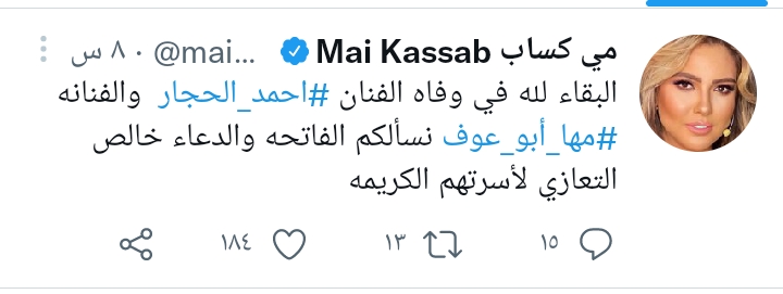 وكتبت الفنانة مي كساب عبر حسابها الشخصي تويتر: البقاء لله في وفاة الفنان احمد الحجار والفنانة مها أبو عوف، نسألكم الفاتحة والدعاء خالص التعازي لأسرتهم الكريمة.