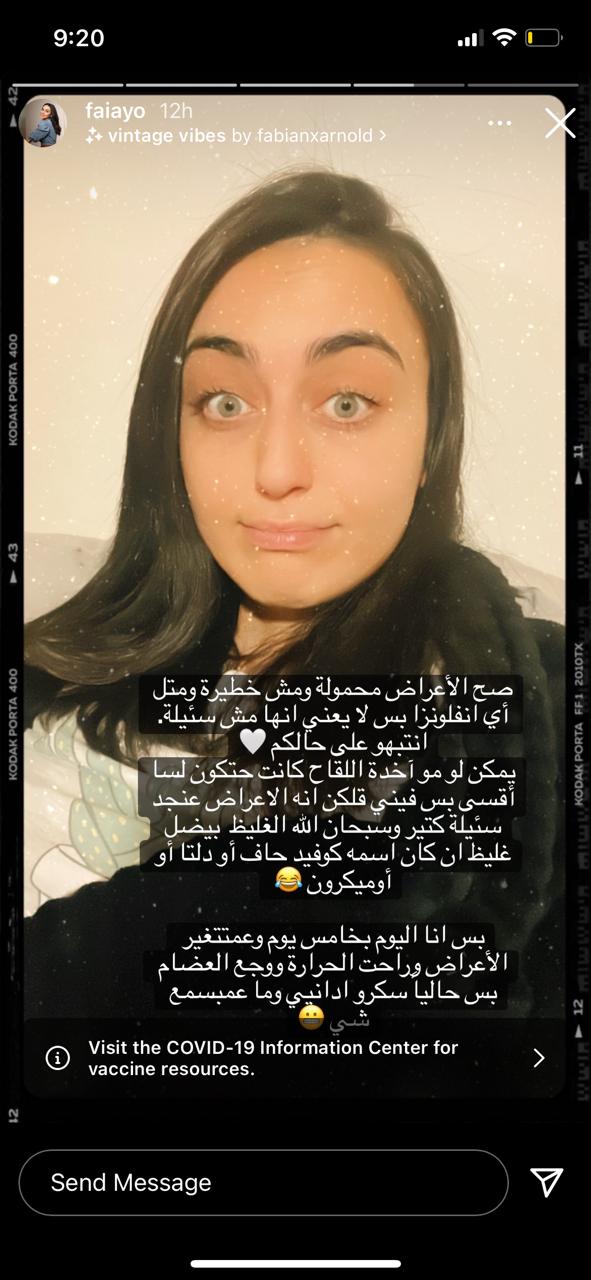 كما كشفت حالتها الصحية، في ستوري أخرى قالت فيها: صح الأعراض محمولة ومش خطيرة، ومثل أي إنفلونزا، بس لا يعني إنها مش سئيلة.. انتبهوا على حالكم، يمكن لو مو آخذة اللقاح كانت هتكون لسه أقسى.