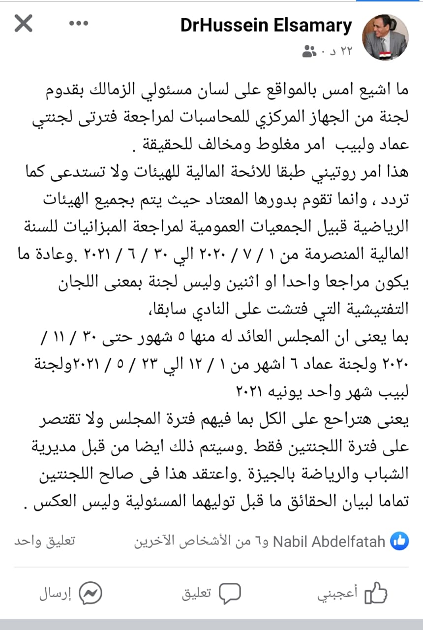 وكتب حسين السمري عبر صفحته على موقع التواصل الاجتماعي فيس بوك قائلًا: ما أشيع أمس بالمواقع على لسان مسئولي الزمالك بقدوم لجنة من الجهاز المركزي للمحاسبات لمراجعة فترتي لجنتي عماد ولبيب أمر مغلوط ومخالف للحقيقة.