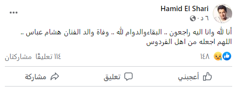 وكتب حميد الشاعري منشورًا، عبر حسابه الشخصي بموقع التواصل الاجتماعي فيس بوك، قال فيه: إنا لله وإنا إليه راجعون، البقاء والدوام لله، وفاة والد الفنان هشام عباس، اللهم اجعله من أهل الفردوس.