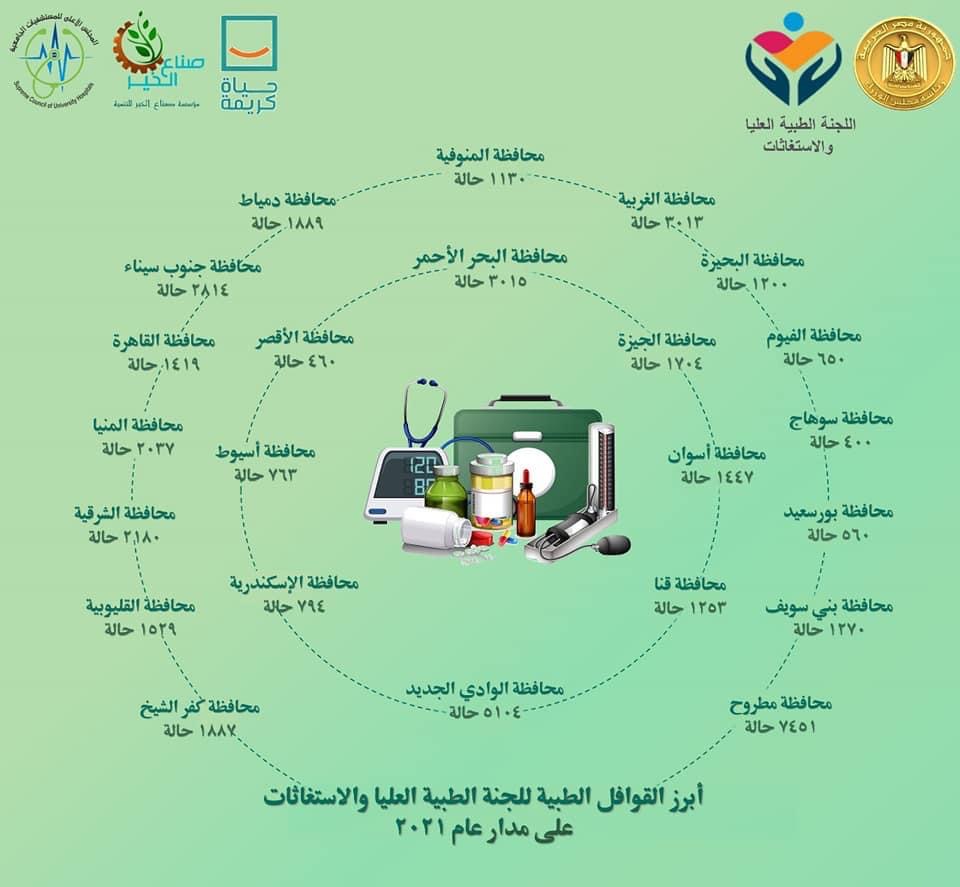 ولفت الدكتور حسام المصري إلى أن عام 2021 شهد تنفيذ عدد كبير من القوافل الطبية التي أطلقتها اللجنة الطبية العليا ولجنة الاستغاثات، بالتعاون مع المجلس الأعلى للمستشفيات الجامعية، وعدد من مؤسسات المجتمع المدني، وساهمت في تغطية معظم محافظات الجمهورية، والوصول بالرعاية الطبية اللازمة لعدد كبير من الحالات، بلغ نحو 44 ألف حالة.