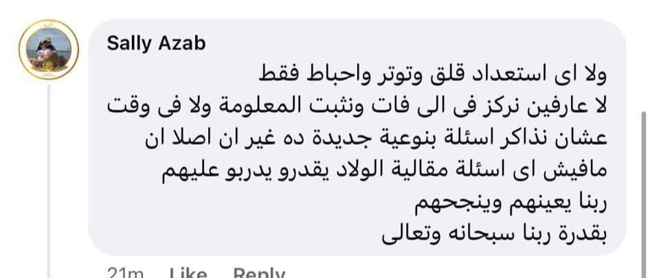 وقالت ولية أمر أخرى: الولاد مش عارفين الأسئلة المقالية هتكون إزاي وعبارة عن اية ومفيش حد دربهم عليها والسنة اللي فاتت لماكانوا في أولي ثانوي مكنش الامتحانات فيها مقالي.