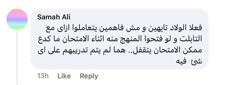 فقالت ولية الأمر: الأولاد فى أولى ثانوى هيمتحنوا بعد أسبوعين ومافيش تدريب على التاب اللى المفروض هيستخدموه وكمان بالاضافه للامتحان هيفتحوا منه الكتب والمفروض يتدربوا على كل حاجه لوحدها وعلى الاتنين مع بعض.