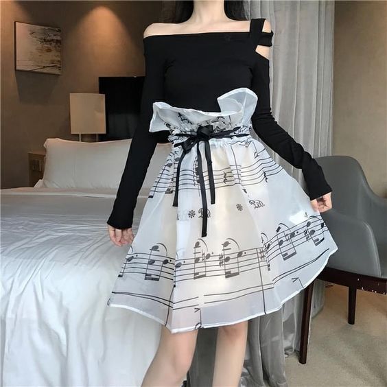 وهو فستان قصير منفوش بتصميم سمبل كب، ومن المنتصف اللون الأسود ومن الأطراف تطريز باللون الأسود أيضًا وباقي الفستان باللون الأبيض، ويناسب هذا الموديل قصة شعر كيرلي قصير.
