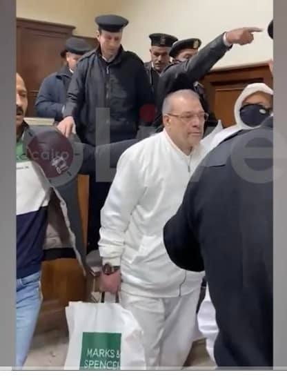 والتقطت عدسة القاهرة 24، رجل الأعمال الشهير، وهو يحمل في يديه شنطة لـ ماركة ماركس أند سبنسر العالمية، وسط حراسة أمنية مشددة، مرتدي ملابس الحبس الاحتياطي البيضاء، وساعة ماركة رولكس Rolex الماركة الأشهر في عالم الساعات، فهي ماركة سويسرية، تعرف بأناقتها وفخامتها وأسعارها الباهظة؛ وتم إيداعه برفقة باقي المتهمين داخل قفص الاتهام.