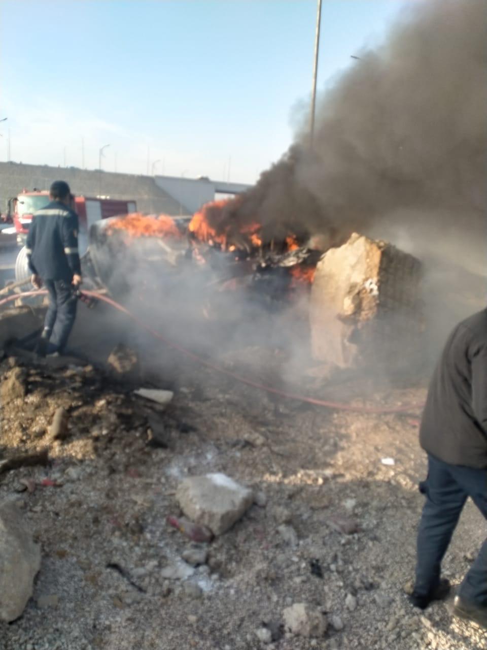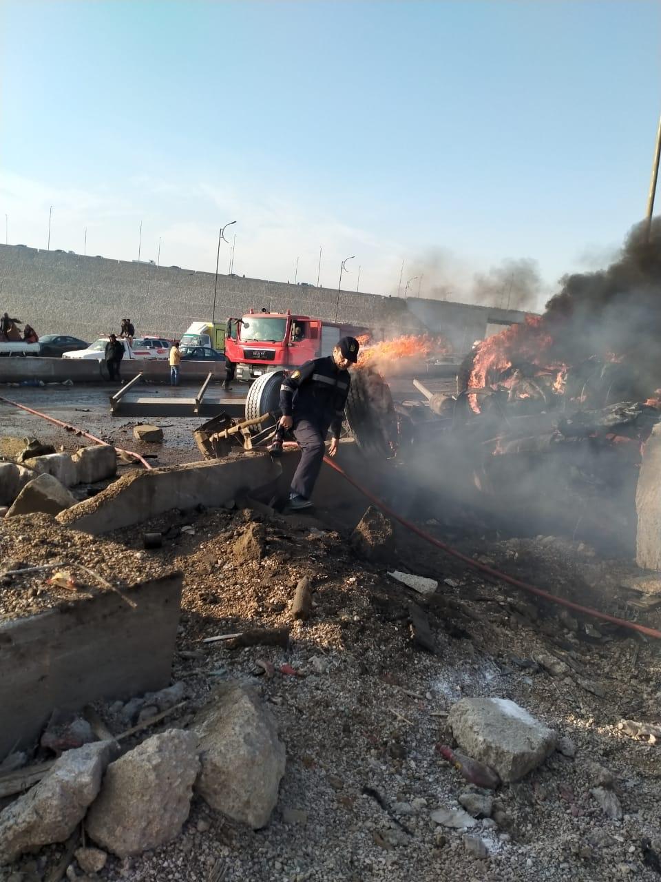 الحماية المدنية تنجح في إخماد حريق تريلا بعد انقلابها بالطريق الأوسطي |صور