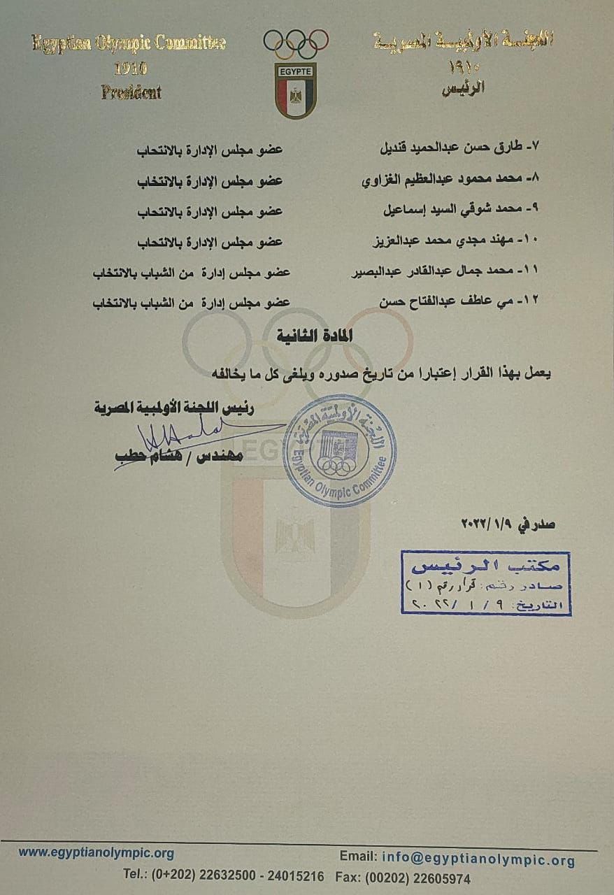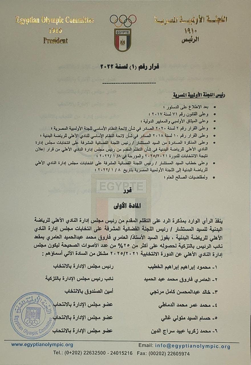 وعلى خطاب المستشار رئيس اللجنة القضائية المشرفة على انتخابات مجلس إدارة النادي الأهلي للرياضة البدنية إلى اللجنة الأولمبية المصرية بتاريخ 8 / 1 /2022 ولمقتضيات الصالح العام.