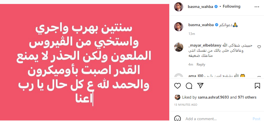 وكتبت بسمة وهبة منشورًا، عبر موقع تبادل الصور والفيديوهات القصيرة انستجرام، قائلة: سنتين بهرب وأجري واستخبى من الفيروس الملعون، لكن الحذر لا يمنع القدر، أصبت بأوميكرون، والحمد لله على كل حال يارب أعنا.