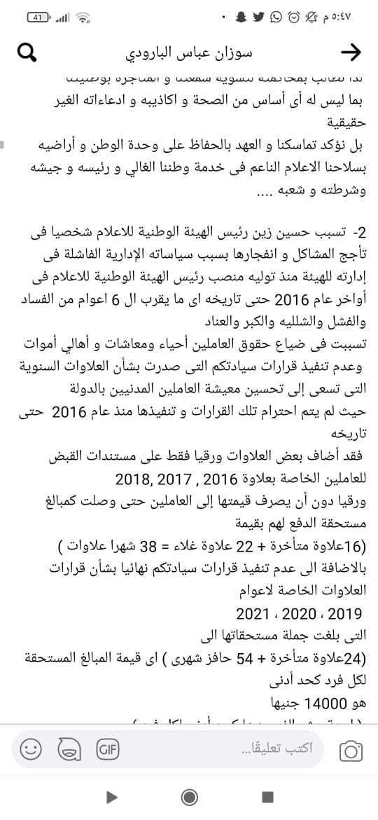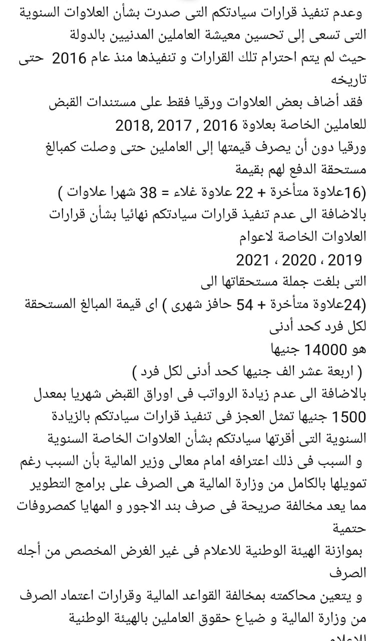 واصل البيان: وعدم تنفيذ قرارات سيادتكم التي صدرت بشأن العلاوات السنوية، التي تسعى إلى تحسين معيشة العاملين المدنيين بالدولة، حيث لم يتم احترام تلك القرارات وتنفيذها منذ عام 2016، حتى تاريخه، فقد أضاف بعض العلاوات ورقيًا فقط، على مستندات القبض للعاملين الخاصة بعلاوة 2016، 2017، 2018، ورقيا دون أن يصرف قيمتها إلى العاملين حتى وصلت كمبالغ مستحقة الدفع لهم بقيمة