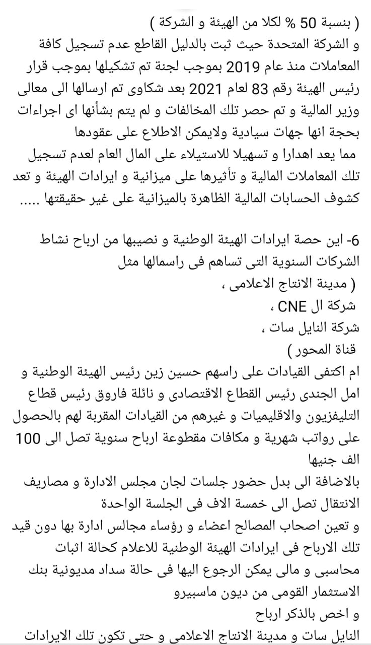 بموازنة الهيئة الوطنية للإعلام في غير الغرض المخصص من أجله الصرف، ويتعين محاكمته بمخالفة القواعد المالية وقرارات اعتماد الصرف من وزارة المالية وضياع حقوق العاملين بالهيئة الوطنية للإعلام.