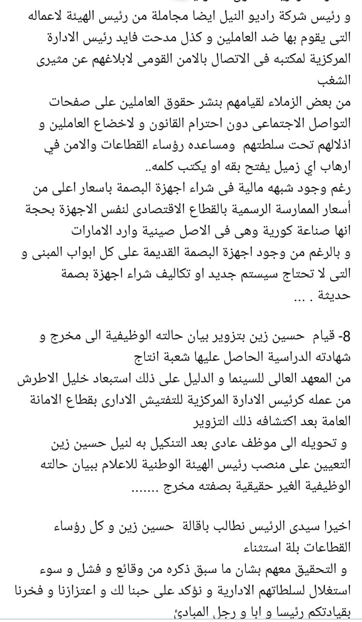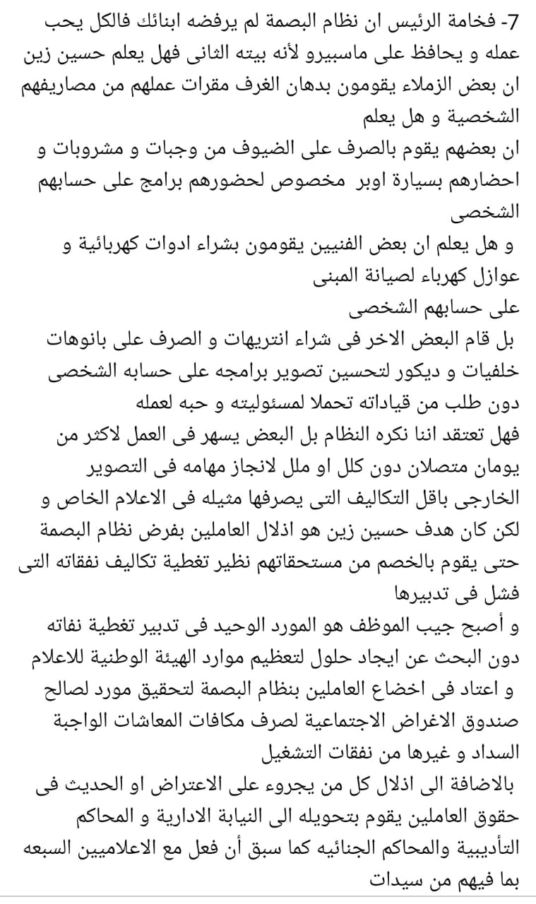 2- تسبب حسين زين رئيس الهيئة الوطنية للإعلام شخصيًا في تأجج المشاكل، وانفجارها بسبب سياساته الإدارية الفاشلة، في إدارته للهيئة منذ توليه منصب رئيس الهيئة الوطنية للإعلام، في أواخر عام 2016، حتى تاريخه أي ما يقرب الـ 6 أعوام من الفساد والفشل والشللية والكبر والعناد، تسببت في ضياع حقوق العاملين أحياء ومعاشات وأهالي أموات.