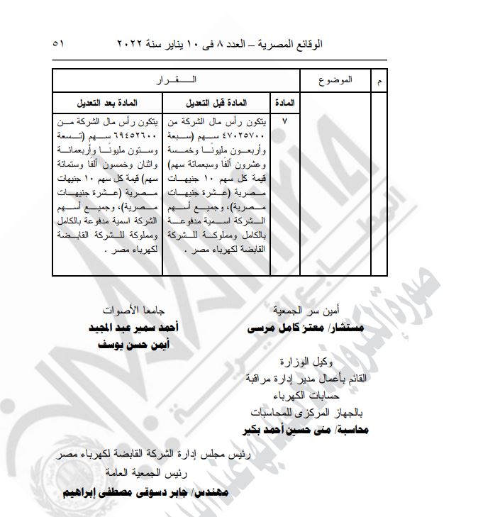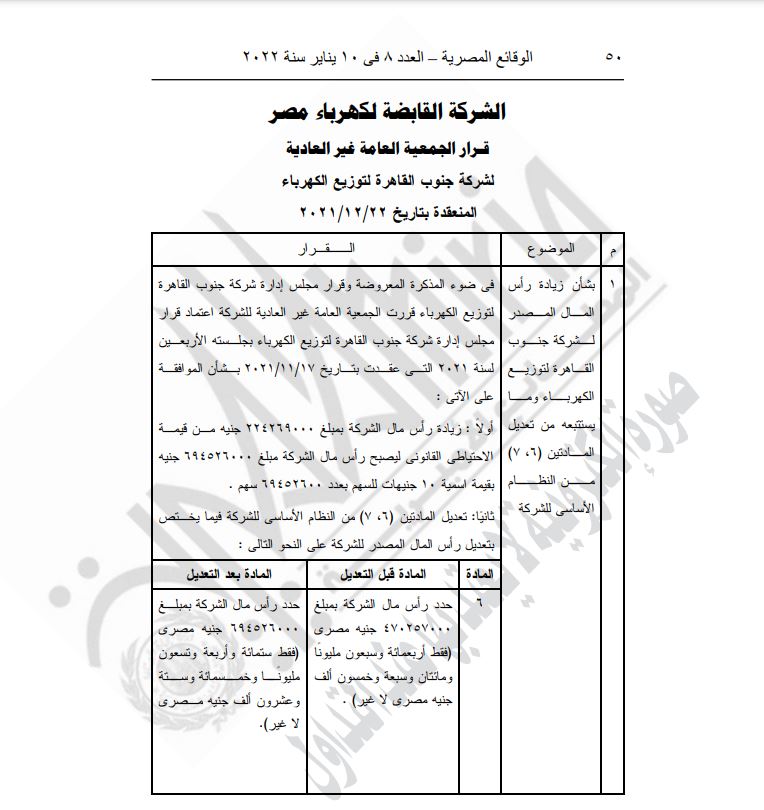 نشرت الجريدة الرسمية قرارات الشركة القابضة لكهرباء مصر، بالجمعية العامة غير العادية لشركة جنوب القاهرة لتوزيع الكهرباء، المنعقدة بتاريخ 22 ديسمبر 2021، وأولها، زيادة رأس المال المصدر لشركة جنوب القاهرة لتوزيع الكهرباء وما يستتبعه من تعديل المادتين 6 و7 من النظام الأساسي للشركة.