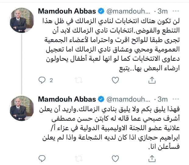 وكتب ممدوح عباس عبر صفحته بموقع التدوينات القصيرة تويتر قائلًا: لن تكون هناك انتخابات لنادي الزمالك في ظل هذا التنطع والفوضى، انتخابات نادي الزمالك، لا بد أن تجرى طبقا للوائح أقرت واحتراما لأعضاء الجمعية العمومية ومحبي وعشاق نادي الزمالك، أما تعجيل دعاوى الانتخابات كما لو إنه ا لعبة أطفال يحاولون إرضاء البعض بها.