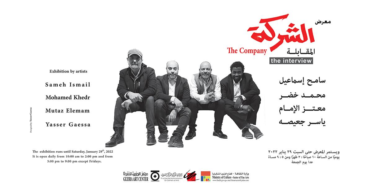 يفتتح الدكتور خالد سرور رئيس قطاع الفنون التشكيلية المعرض الأول للمشروع الفني الشركة، تحت عنوان المقابلة، ويضم أعمال الفنانين الأربعة المؤسسين وهم: سامح إسماعيل، محمد خضر، معتز الإمام، ياسر جعيصة، وذلك غدا الأربعاء 12 يناير 2022 في تمام السابعة مساءًا في مركز الجزيرة للفنون بالزمالك.