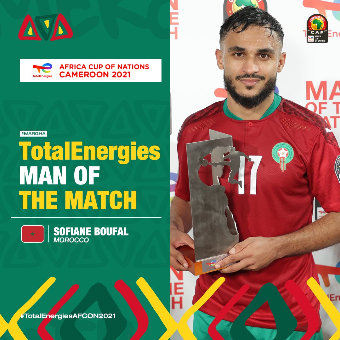 فاز سفيان بوفال، نجم منتخب المغرب لكرة القدم، بجائزة رجل مباراة منتخب بلاده ضد نظيره غانا، وذلك ضمن منافسات الجولة الأولى من دور المجموعات بكأس الأمم الإفريقية 2021، خاصة أن هدفه الحاسم قاد منتخب أسود الأطلسي للفوز في لقاء الليلة، وحصد أول 3 نقاط في المنافسة الإفريقية.