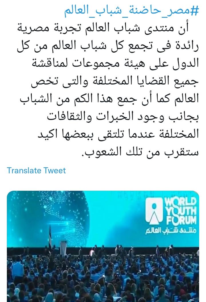 مستخدم آخر تفاعل مع هاشتاج منتدى عالمي للشباب، فقال: منتدى شباب العالم تجربة مصرية رائدة تجمع كل شباب العالم من كل الدول على هيئة مجموعات لمناقشة جميع القضايا المختلفة، والتى تخص العالم، كما أن جمع هذا الكم من الشباب بجانب وجود الخبرات والثقافات المختلفة عندما تلتقى ببعضها أكيد ستقرب من تلك الشعوب.